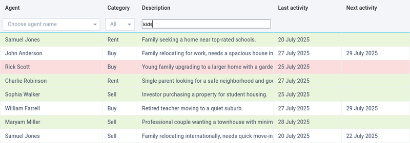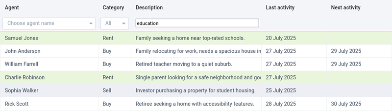 Example: Searching "education" returns properties mentioning "family seeking home near top-rated schools" and _"Investor purchasing a property for student housing"
