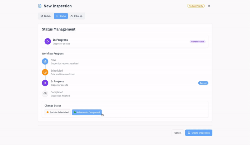 If you want to add more features, use another prompt. For example: “Design an inspection form with sections for property address, homeowner details, inspection type, date/time scheduling, inspector assignment, and status tracking. Include file upload for documents/images with previews and deletion. The form should support status changes (new → scheduled → in progress → completed).”