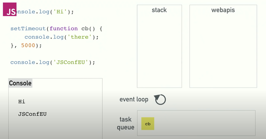 The job of the event loop is to watch for the stack and the task queue. If the stack is empty and the task queue is not, it will push the first item from the queue to the stack, effectively running it. The 'webapis' section is what we get from whatever our environment provides us with, in this case it's the browser providing us with the ability to keep track of the setTimeout