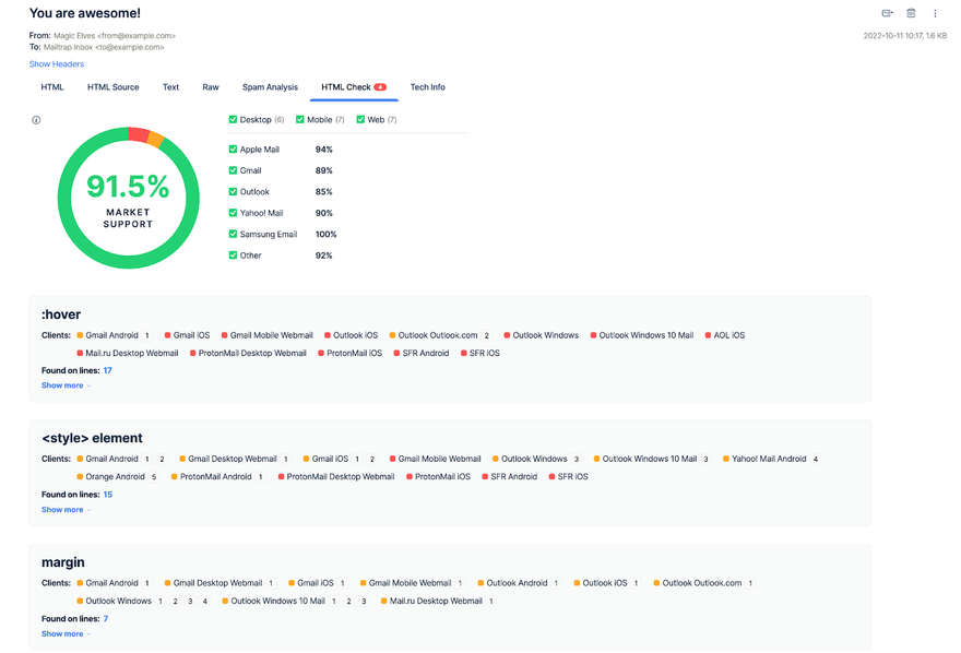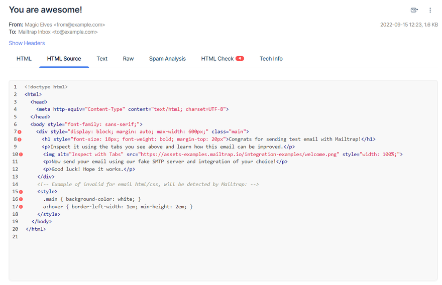 No matter whether it’s a PHP, Python, Javascript, or any other language email library, it’s designed for sending and lacks proper testing capabilities. To do all of these tests, you’ll need a comprehensive tool, one like Mailtrap Email Sandbox. The Sandbox is widely used by developers to inspect emails and perform SMTP debugging in a safe environment without the risk of spamming recipients.
