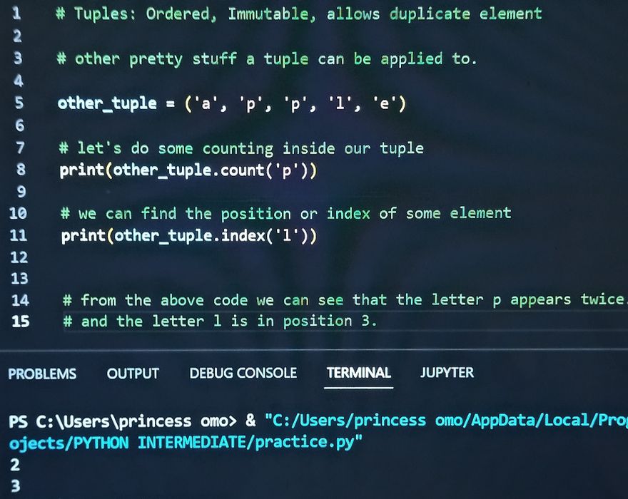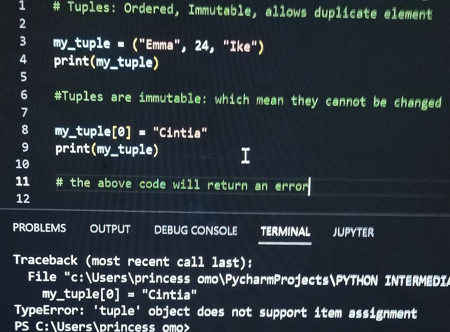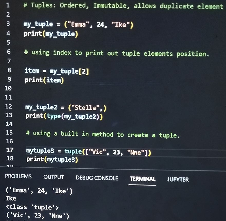 Tuple is one of 4 built-in data types in Python used to store collections of data, the other 3 are List, Set, and Dictionary, all with different qualities and usage. A tuple is a collection which is ordered and unchangeable.
