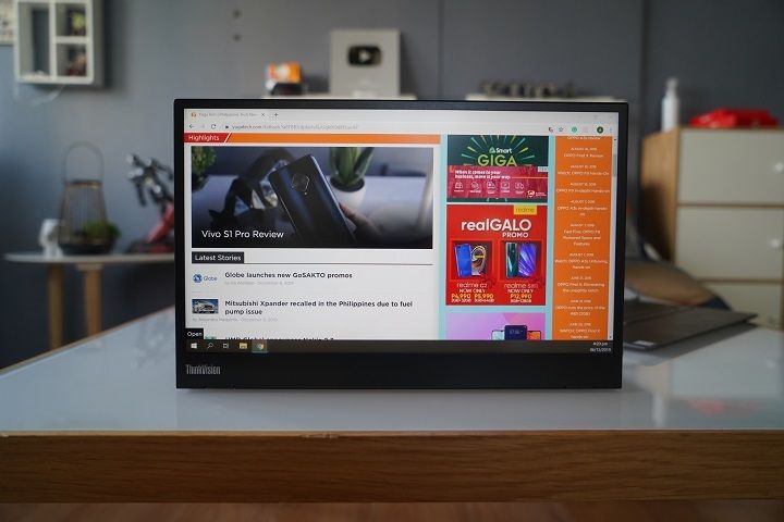 The tilt range on the ThinkVision M 14 includes a portrait mode and 5 to 50 degrees. with a maximum brightness of 244 nits and 98% sRGB color space coverage.