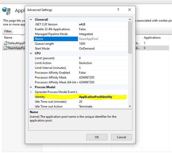 After that right-click on the new app pool and select Advanced Settings. You will see below window.