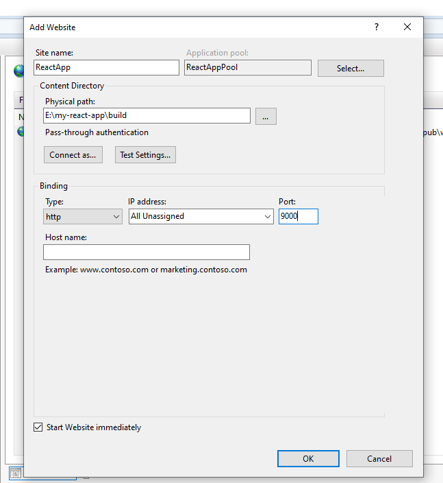 After that right-click on Sites and then click on Add Website. Add the Site name and select application pool which we created earlier. After that under physical path section, you have to give the path of build folder & also give the port number where you want to host.