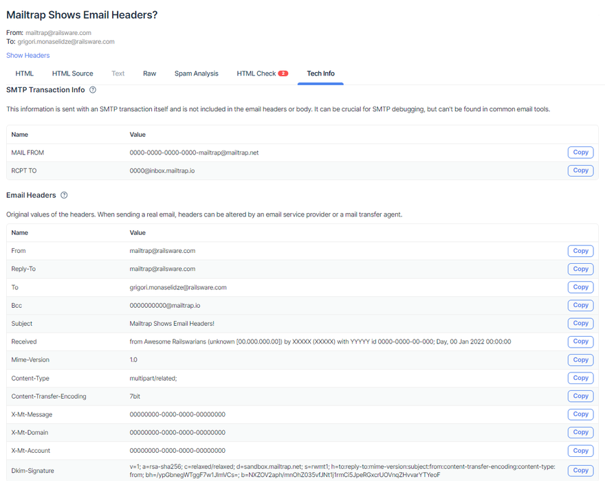 You can perform all these checks from your Mailtrap inbox. Subject, From, and To headers are available once you open the message. To view more, click on Show Headers or head directly to the Tech Tab.