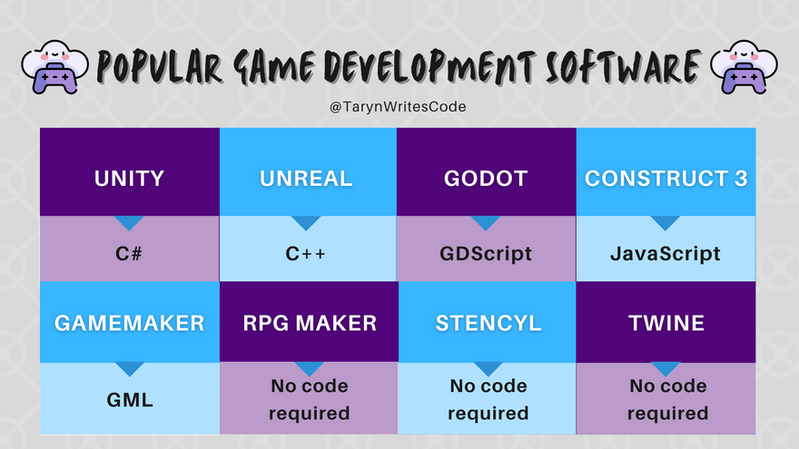 In case you're new to game development, I made a chart which shows the most popular game development software and their associated languages. Keep in mind that some of these programs officially support additional languages beyond what I've included in this chart.