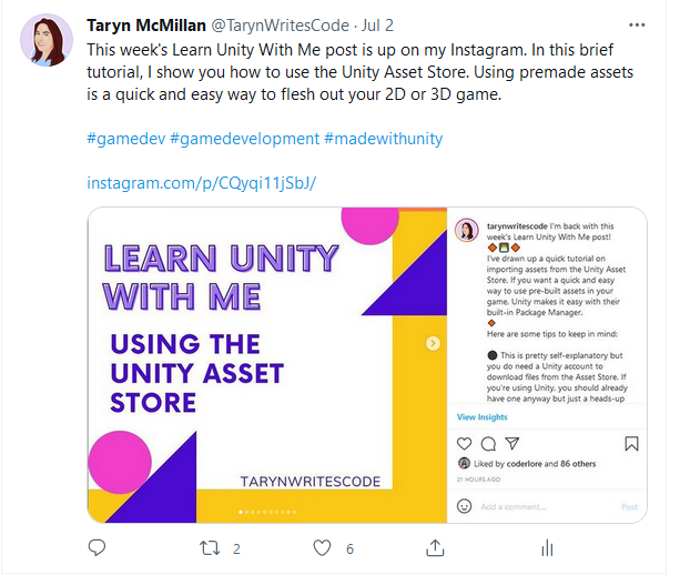 Use hashtags for personal branding : Hashtags can be a good way to organize and brand your posts. For example, I tag all of my weekly Unity tutorial posts using the same hashtag so that they are easy to find and read.