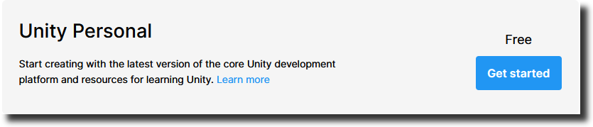 Scroll down until you find the grey box with the heading Unity Personal. Click Get started.