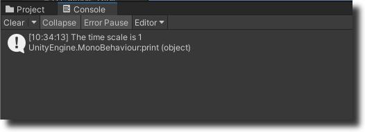 The Console is where debugging occurs in Unity. You can print logs to the Console in your C# scripts using print() or Debug.Log(). The Console displays warnings and errors in your project. You can double-click on them to see where these problems exist in your scripts.