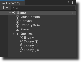 The Hierarchy contains all of your game assets, including those not currently in your scene.