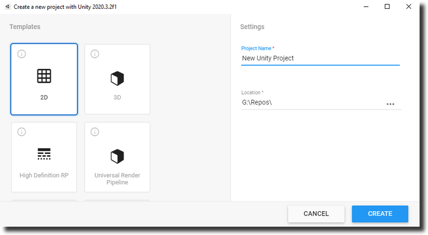 Open up the Unity hub. In the top-right corner, click New to launch the New Project Window. Select 2D under Templates and enter a Project Name and Location. Then click Create.