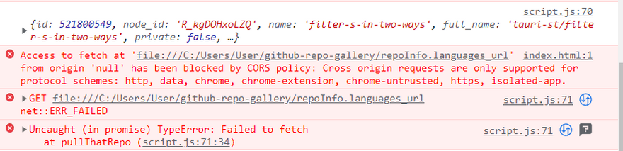 So I went for the easy-pickings first and investigating line 71 for errors, but didn't see any! I briefly went down the wrong rabbit hole and Googled the code about access to origin being blocked by the CORS policy, but I didn't go too deep before seeking some feedback on the Skillcrush Slack.