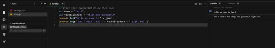Then alls I did today was a little practice adding values to variables and logging them out to the console in sentences. {: Just look at them statements, wiao.