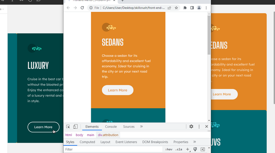 Worked a little more on my Front End Mentor challenge today using a Skillcrush example to realize why my cards weren't wrapping! I was so focused on mobile-first that I couldn't figure out how to change from column to row from mobile > desktop, but mobile first is primarily for design decisions and deciding which sections will be flex(or grid) should start with desktop then compare to mobile! So I finally got those cards adjusting just by allowing a row wrap to squeeze the cards, just gotta make a few more tweaks to the Desktop spacing (on the left, vs mobile on the right of my page) and I get to research how to alter buttons after they've been clicked-on with just HTML/CSS!