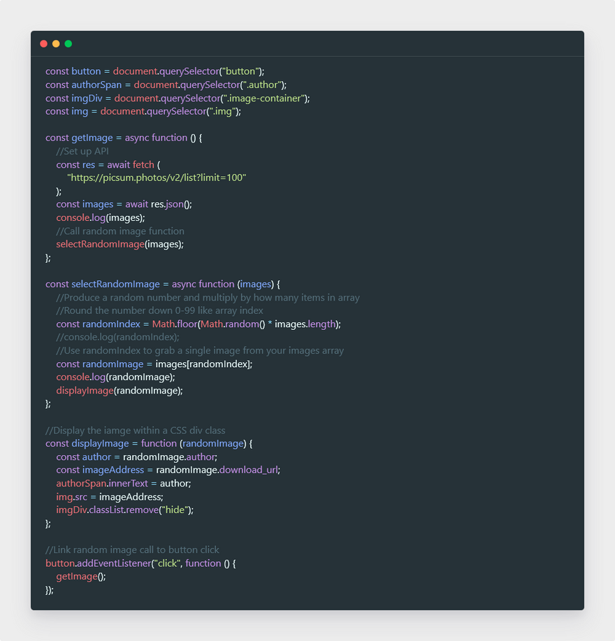 I did a little JS today. Here's a code snippet to oogle of me fetching an API for random images from the Lorem Picsum API:
