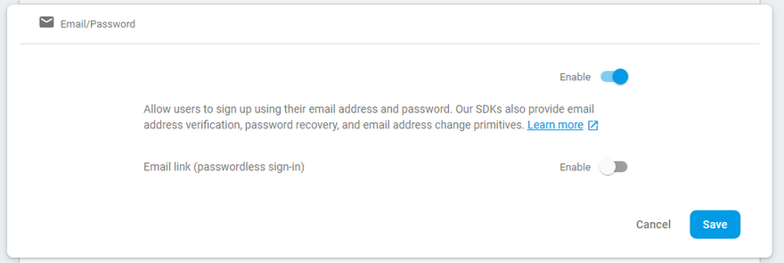 The most basic sign in option, this allows users to use their email/password to sign up/in. Enabling this is as easy as flipping the first toggle switch after clicking "Email/Password" from the Sign-In providers list, then clicking "Save".