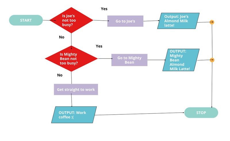 So we will write an else statement that says go to Mighty Bean. Once Leslie gets to Mighty Bean, she needs to check if it is busy so we will need another if statement. If Mighty Bean isnāt busy, then she will get an almond milk latte.