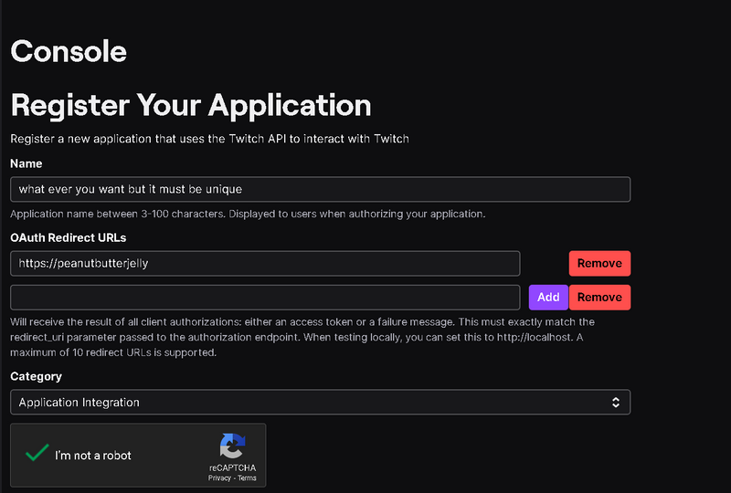 https://peanutbutterjellyas the redirect URI, but why? The only restrictive part of this URI is thehttps, as Twitch will not allow any other type of protocol. Thepeanutbutterjellypart is purely up to you, as there is no restrictions. However, it is common practice to usecom.yourappname(what your application's name it) - In order for us to utilize this
