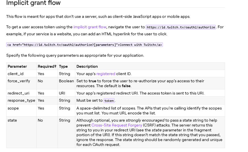 2) App access tokens : APIs that do not require the user's permission to access use this type of token. This type of token is acquired through the authorization code grant flow. The downside of this authentication process is that is requires the use of a client_secret. Meaning that we can not make our application 100% secure without using a reverse proxy server. However, the upside is that the user does not have to be logged in to their twitch account to access API data.(this tutorial will not be covering this type of token)