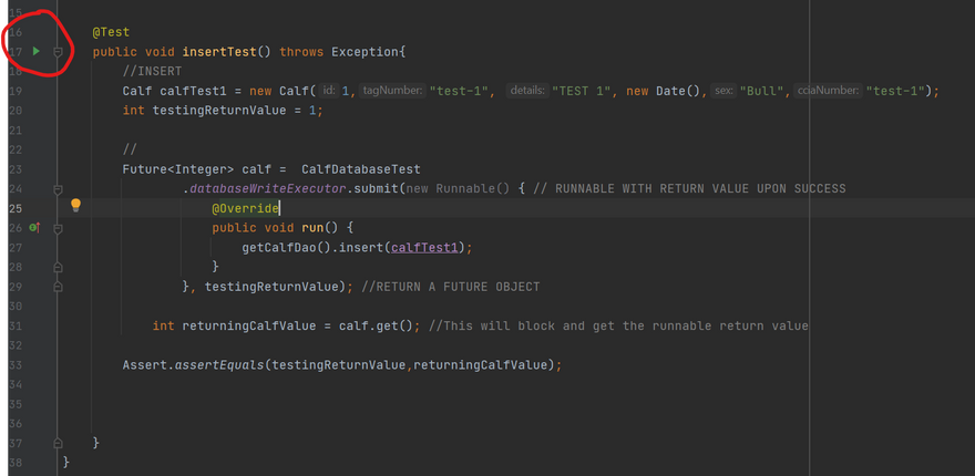 testingReturnValueis an integer. Next we access our fixed thread pool,CalfDatabaseTest.databaseWriteExecutor. This gives us access to the worker threads which we can assign asynchronous tasks to. We create a task through the submit method and provide it a Runnable.submit(new Runnable(),testingReturnValue), since the Runnable does not have a return value we provide one withtestingReturnValue. Inside the Runnable we override therunmethod and call the task that we want done on the worker thread. Since this code is asynchronous, we need to block and wait for the value. We do that with theget()method. Theget()method will block until it gets a return value.