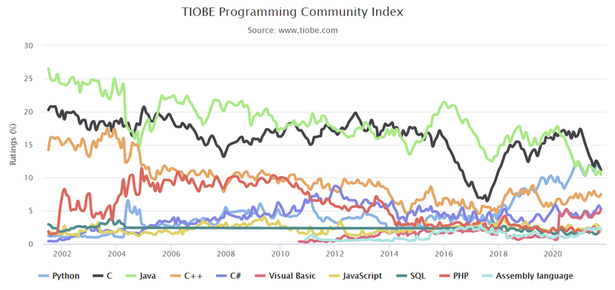 Fig.1 - Most important programming languages over time according to tiobe at https://www.tiobe.com/tiobe-index