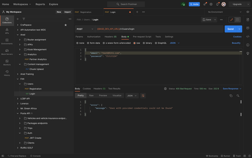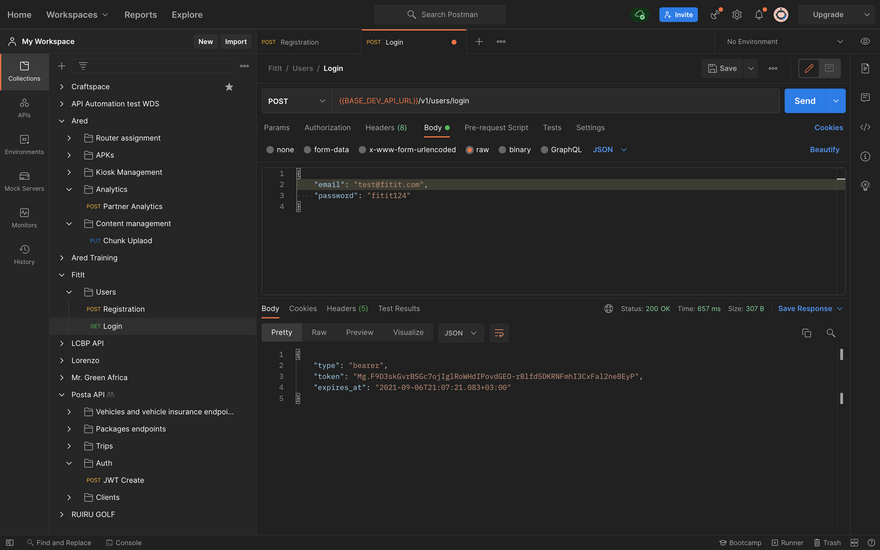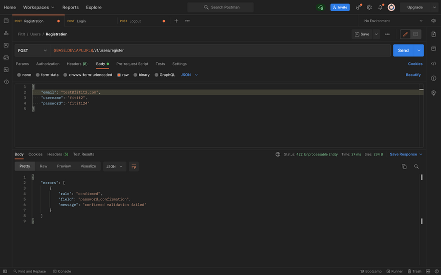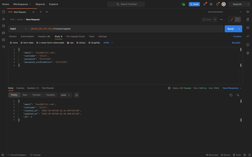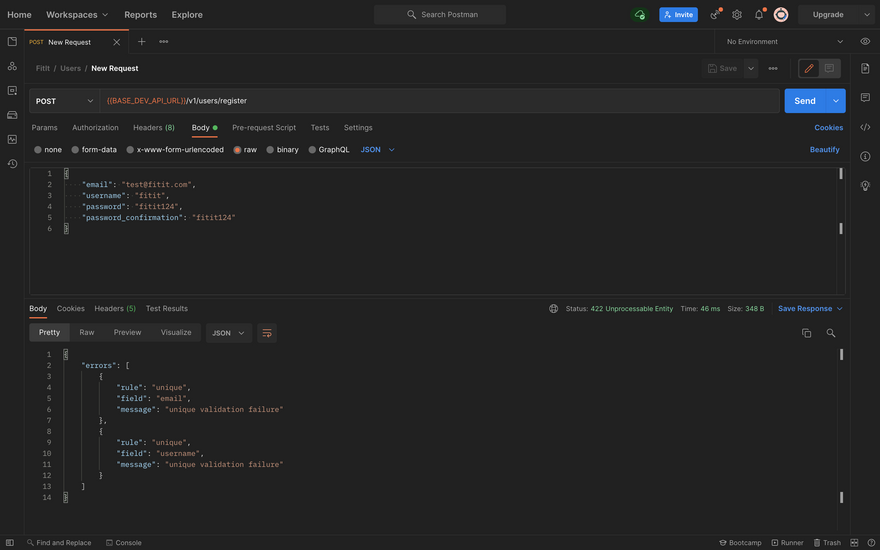 We will be using postman for testing, for my setup, I've made a collection and added a global URL variable called BASE_DEV_API_URL, which is basically, http://localhost:3333/api