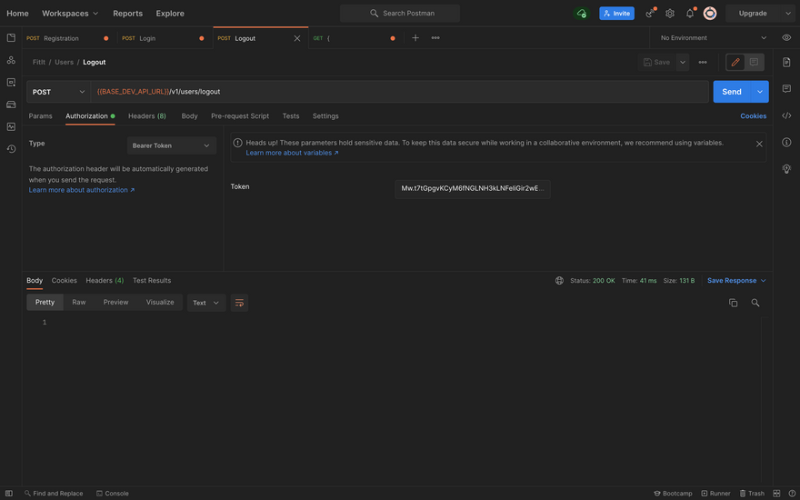 Bearer tokenunder the authorization tab in Postman. Hit thehttp:/localhost:3333/api/v1/users/logouturl. The result, if successful should be a status 200.