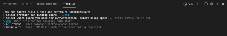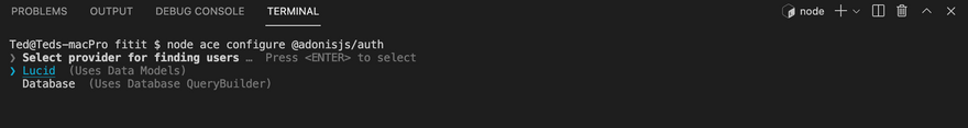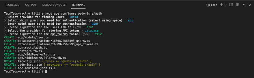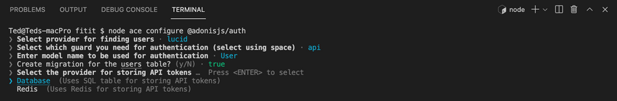 After successful installation, as earlier mentioned on the configuration of packages, we configure the package settings by running node ace configure @adonis/auth