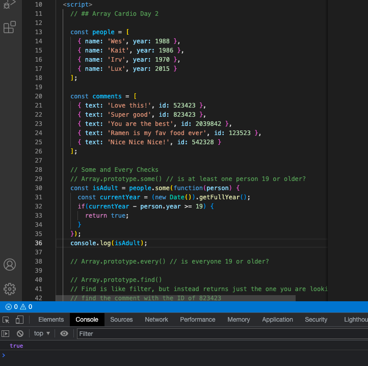 So we are running this function against the people array. Creating a new function to get the currentYear and then subtracting the year born of the person. If that is equal to or greater than 19, the console log returns true.