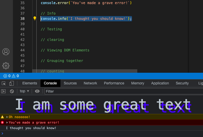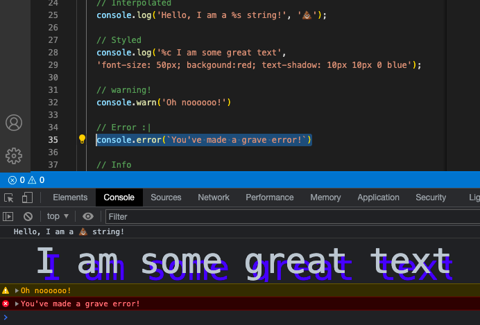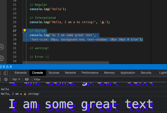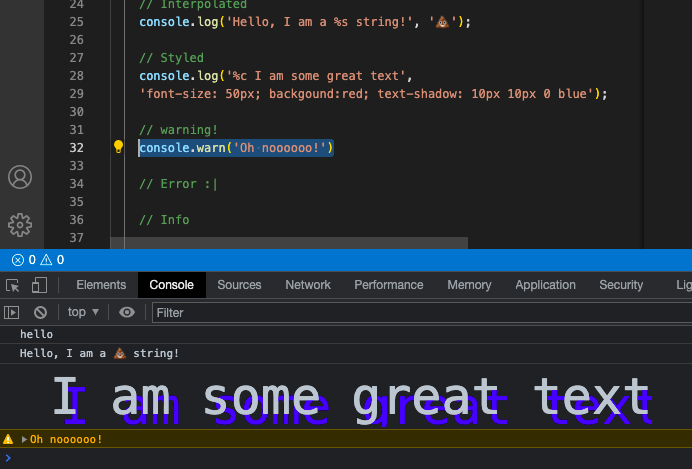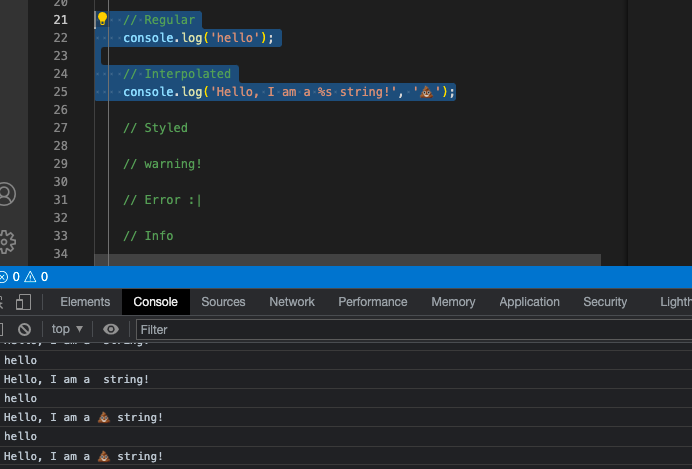 The first one, the regular console log! The second one I've never seen before is called the Interpolated console log where we run the %s through it.