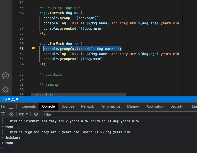 Group console is a great way to group a bunch of console log messages together. Now.. my console log message is already combined into one cuz I went off script, but you can see how it would function in the screen shot.