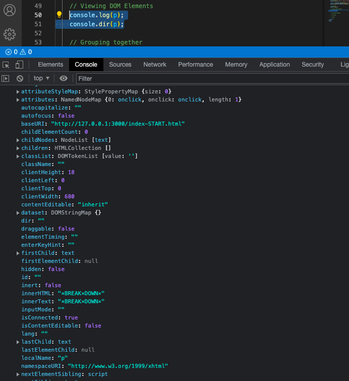 Dir console will allow you to see everything on that element, so we are seeing everything on the paragraph element listed in the console.