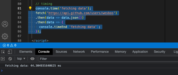 Time console gives you an amount of time for how long it took (in this example) to fetch the data.