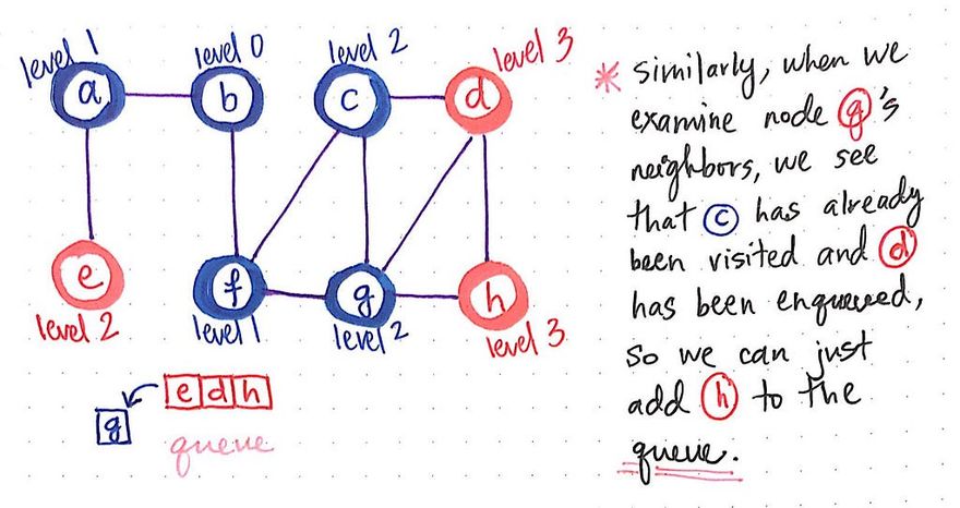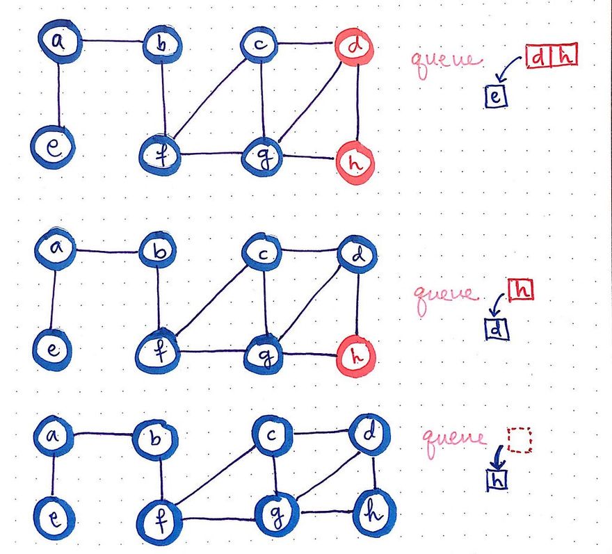 It’s a similar story for nodes d and h. In both of these cases, each of these two node’s neighbors have either 1) already been visited or 2) are already in the queue, waiting to be visited.