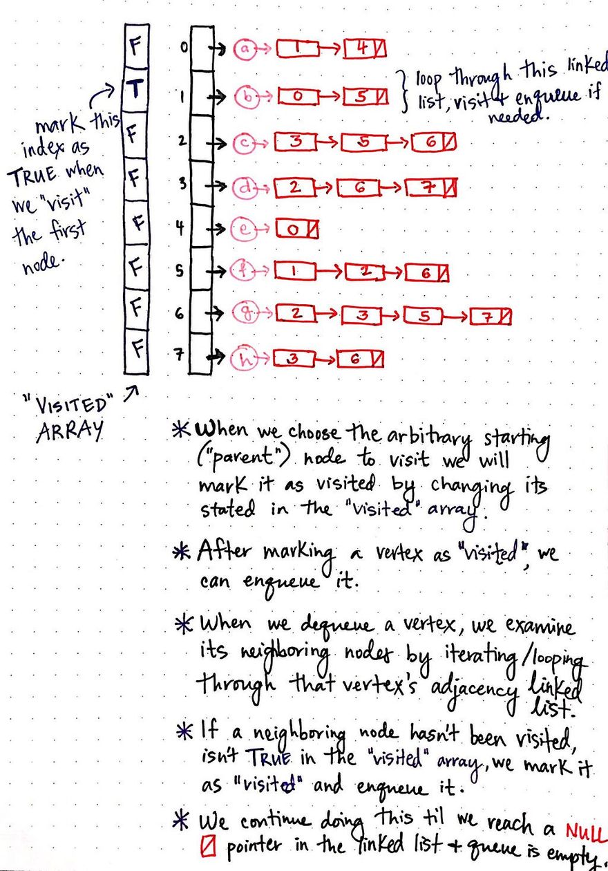 - Then, after changing its value from FALSE to TRUE in the “visited” array, we’d enqueue it.