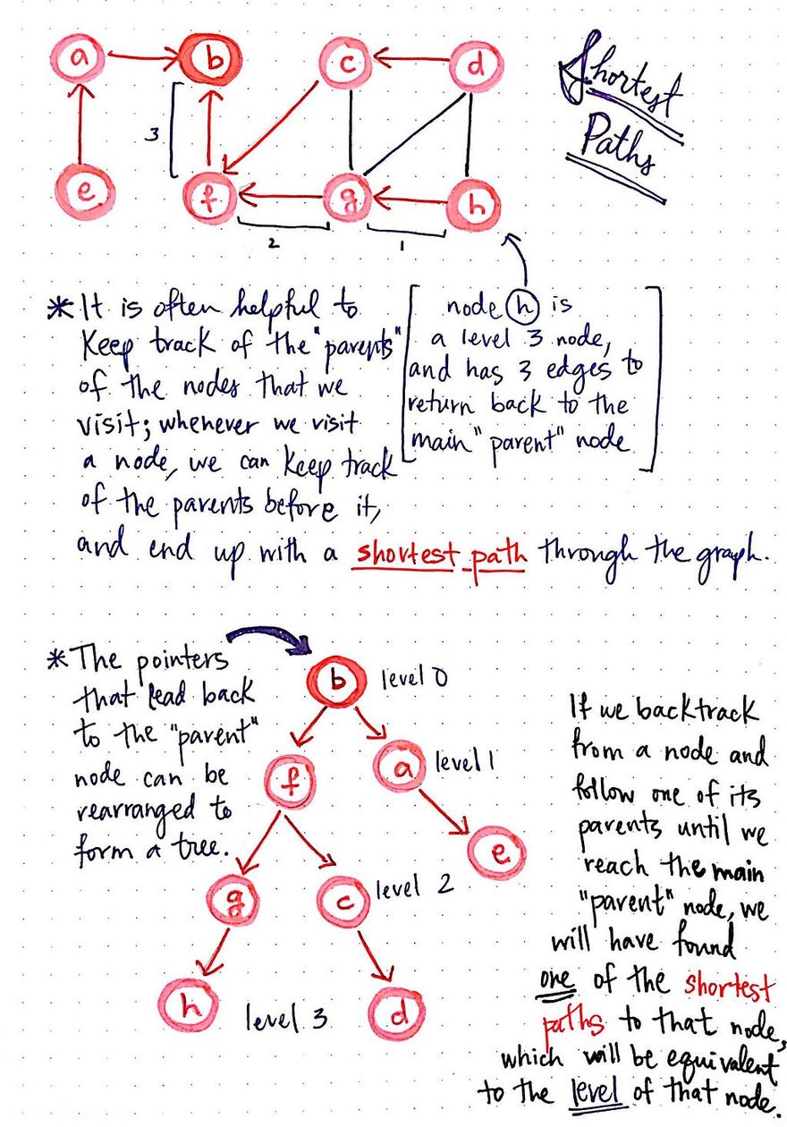 For example, node h is a level 3 node and has 3 edges/pointers that we can follow to return to the parent node, node b. There could also be a path from node h to b that is much longer than 3 steps, or there could be multiple 3-step “shortest paths” from node h to b. The important thing is that we have at least one of those shortest paths easily accessible to us by virtue of what we backtracked and found through our BFS graph traversal.