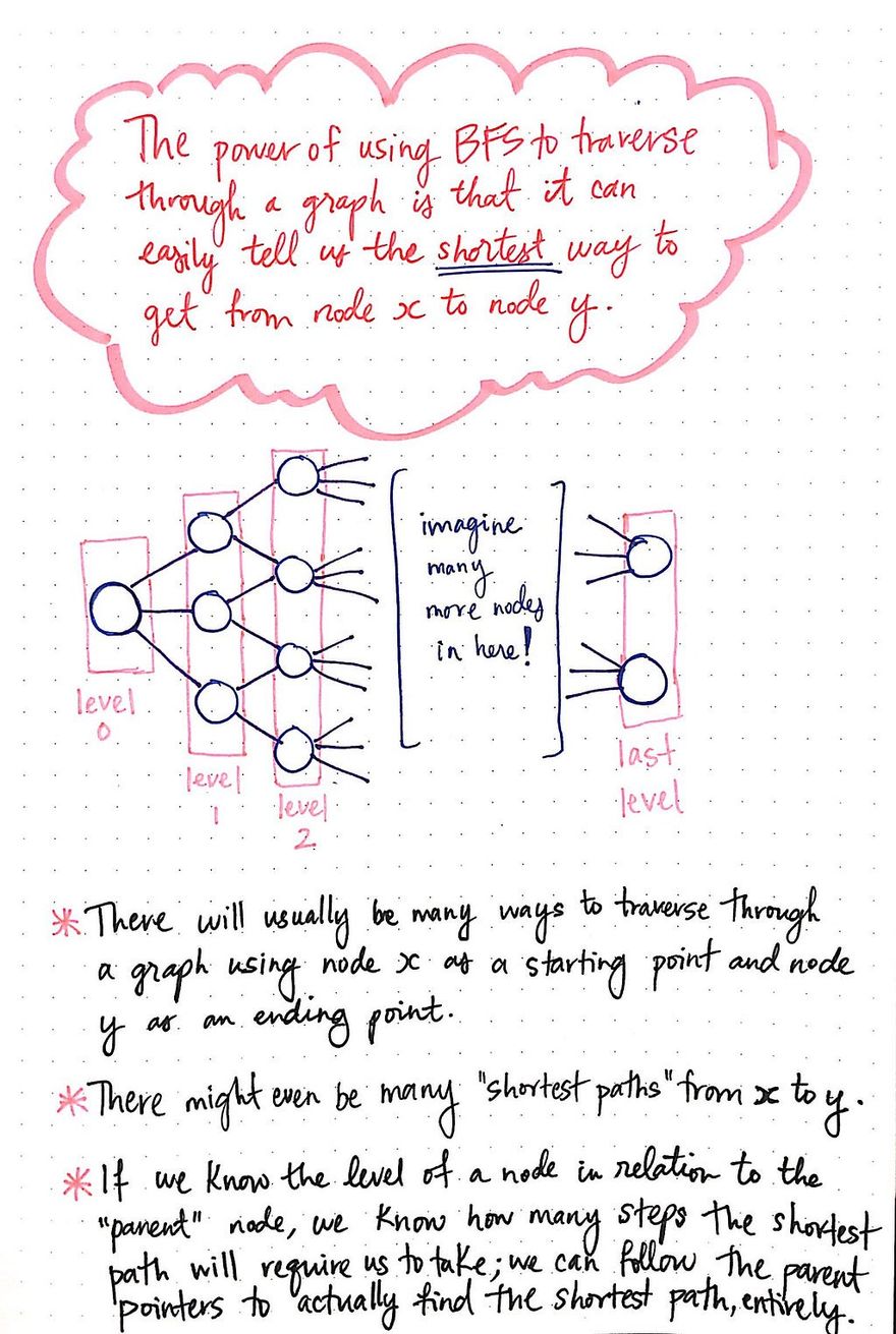 The power of using breadth-first search to traverse through a graph is that it can easily tell us the shortest way to get from one node to another.