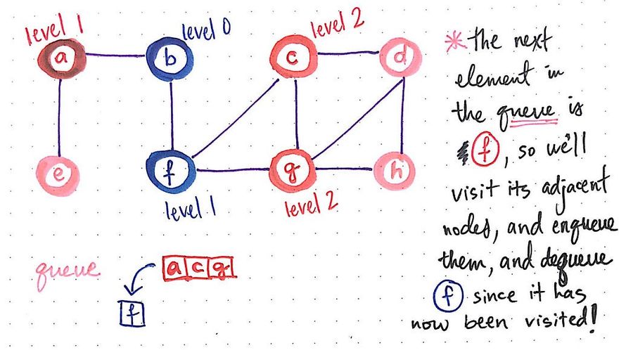 Once we’ve visited node b and added its neighbors to the queue, we can dequeue node b, since we’ve done everything that we need to with it. Effectively, we’re dequeuing node b, and enqueuing nodes f and a. Note that either node a or f could have been added first in the queue; since they both are neighbors, it doesn’t matter what order they’re added to the queue, as long as they’re added together.