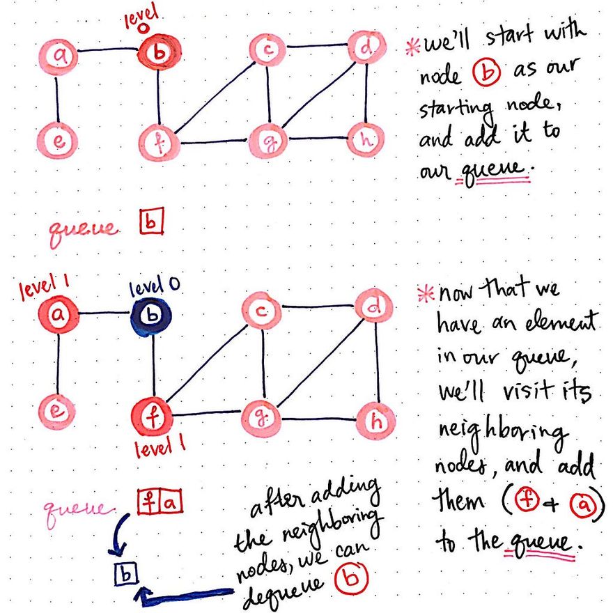 For example, let’s take the first step of adding node b to the queue and actually visiting it; what all would that involve?