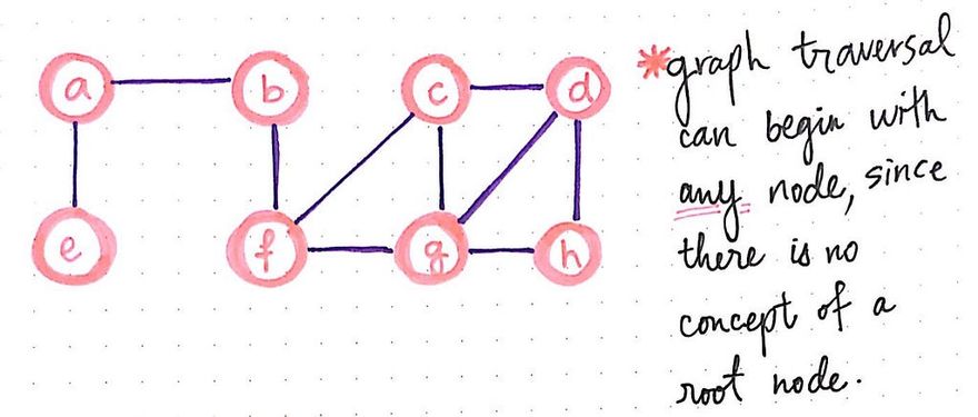 Before we can decide how to traverse through this graph, we need a starting point. As it turns out, the first — and probably the major — difference between graph and tree traversal is deciding where to start searching! In a tree traversal, we always start with the root node, and, for BFS, work our way down through the tree structure, level by level. But, when dealing with a graph, there is not obvious start, since there is no concept of a “root” node.