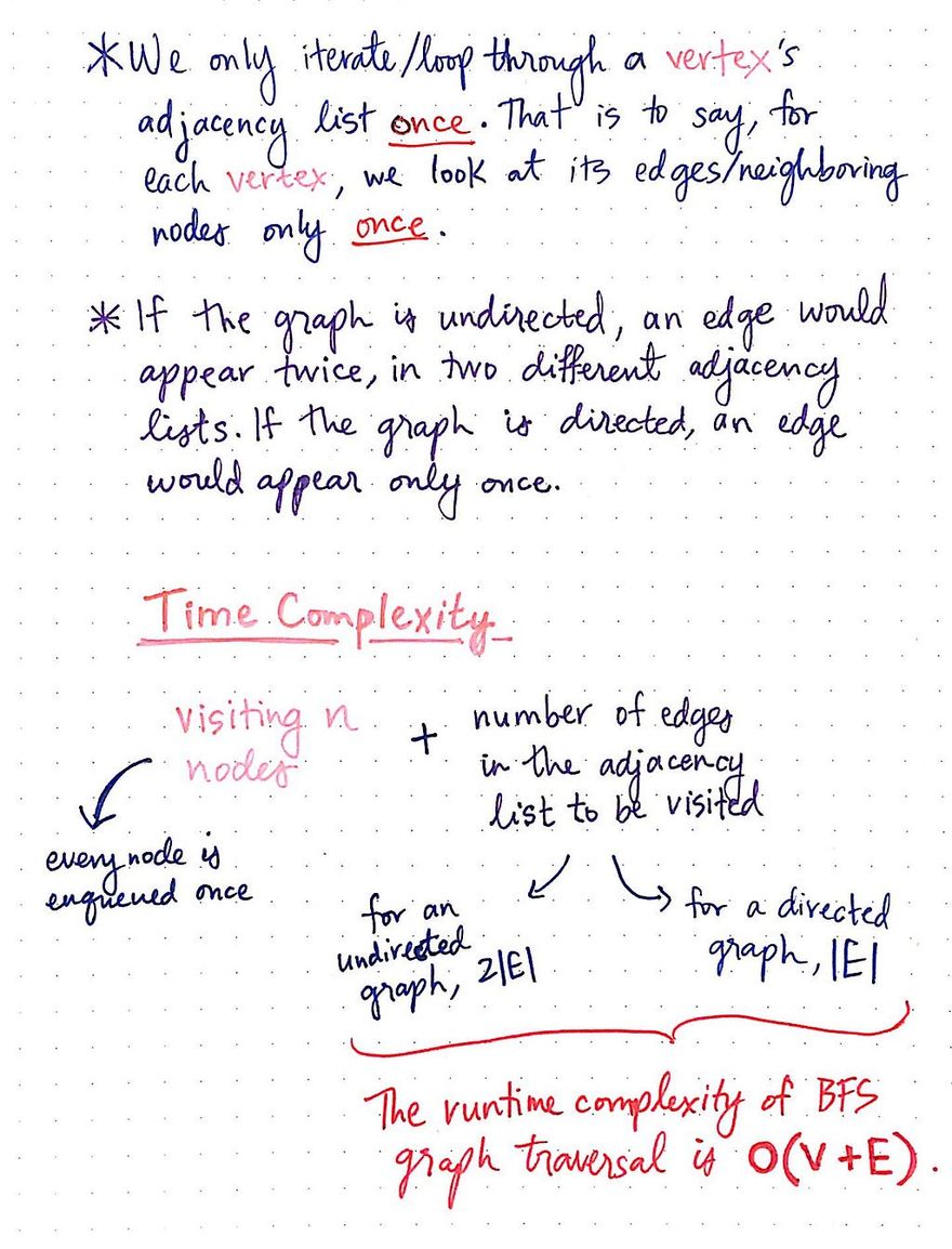 Thinking about what we need to do for one single node, the runtime complexity becomes a bit more obvious. For every single vertex in the graph, we will end up iterating through the vertex’s adjacency list once. That is to say, we will need to look at its neighboring nodes (which, in the adjacency list, is really jsut a representation of all of its edges) only one time — when we go to dequeue it, and enqueue any necessary neighbors.