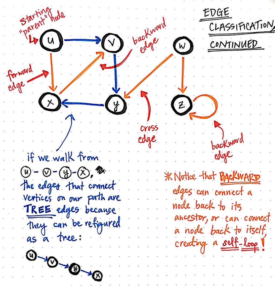 In the illustration shown here, we can see that the tree edges, highlighted in blue, are the ones that we walk through as part of our traversal down our path in the graph; in this case, our walk is u-v-y-x. The edges connecting these vertices in our path are our tree edges. However, we could have also walked “forward” in a different path, and walked from u to x; thus, the edge (u, x) is a forward edge.
