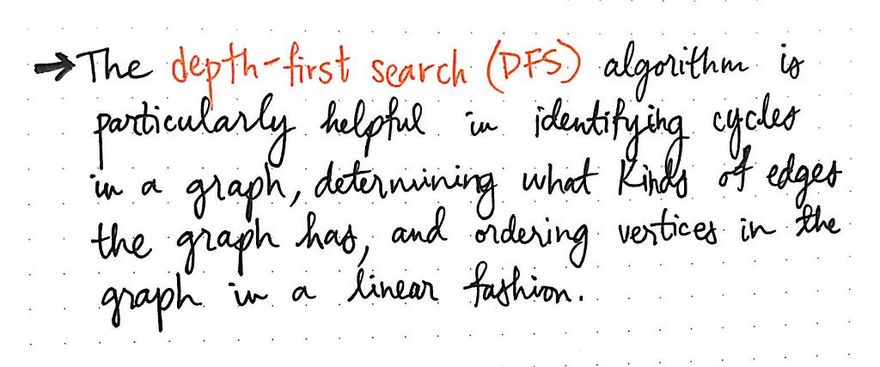Throughout our exploration of graphs, we’ve focused mostly onrepresenting graphs, and how to search through them. Last week, we looked at depth-first search (DFS), a graph traversal algorithm that recursively determines whether or not a path exists between two given nodes. However, it’s worth cycling back to depth-first search again for a few reasons.