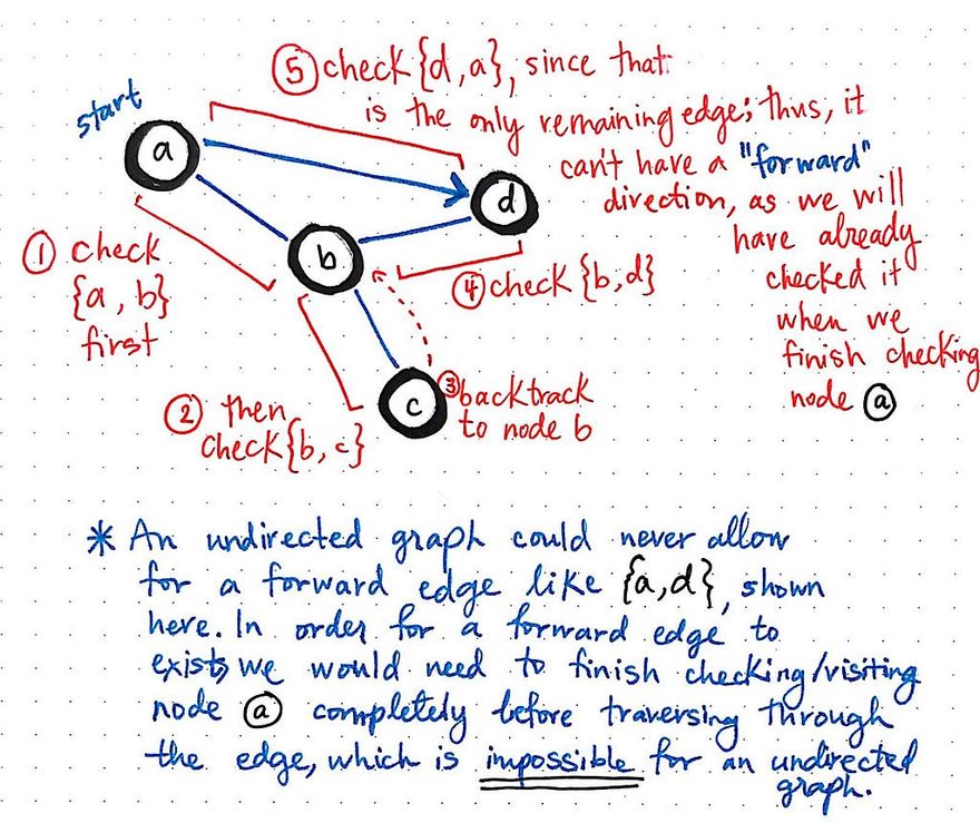 An undirected graph can never allow for a forward edge like (a, d) since, in order for a forward edge to exist, we would need to completely finish visiting all the nodes reachable from our starting node a before traversing through the edge. In an undirected graph, this is literally impossible to do! So, the edge between these two nodes really ought to be written like this: {a, d}, since we can traverse in either direction on this edge, depending on which node we start with.