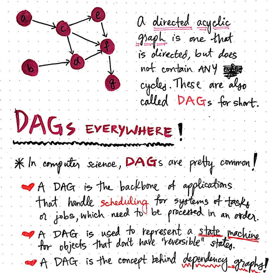 DAGs are somewhat infamous in computer science because they’re pretty much everywhere in sofware. For example, a directed acyclic graph is the backbone of applications that handle scheduling for systems of tasks or handling jobs — especially those that need to be processed in a particular order. At a higher level, DAGs are used to represent state machines, which are often used to keep track of objects that have a mutable state in web and mobile applications.
