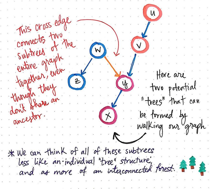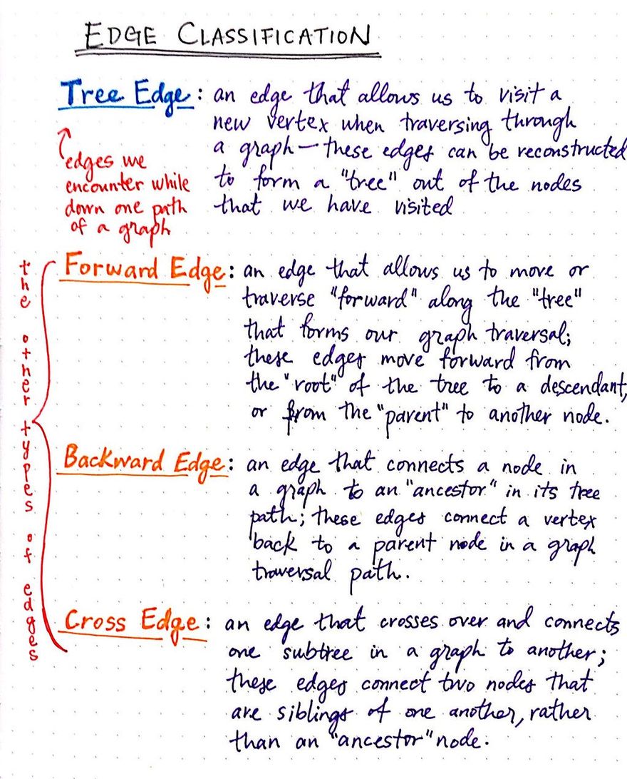 The first of the three is called a forward edge , as it allows us to move “forward” through the graph, and could potentially be part of another path down the tree. By contrast, there is also the backward edge , which connects a node in a graph “back up” to one of its ancestors (its parent or grandparent node, for example, or even back to itself!). Finally, there is the cross edge , which “crosses over” and connects one subtree in a graph to another. In other words, a cross edge connects to sibling nodes that don’t necessarily share an ancestor in a tree path, but connects them anyways.