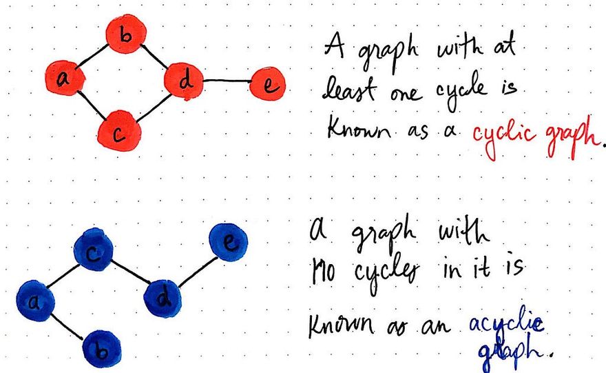 A cycle , in the context of a graph, occurs when some number of vertices are connected to one another in a closed chain of edges. A graph that contains at least one cycle is known as a cyclic graph. Conversely, a graph that contains zero cycles is known as an acyclic graph.