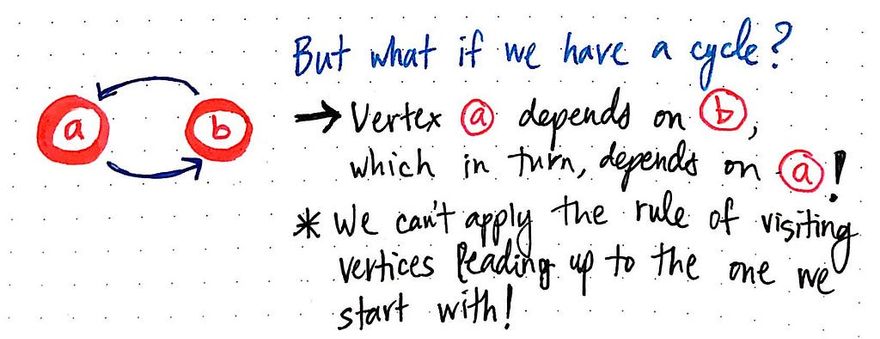 In this example, vertex a depends on b, which in turn, depends back on a. The issue here is that we can’t apply the rule of visiting the vertices that “lead up” to the one we’re starting with, because they both lead up to one another.