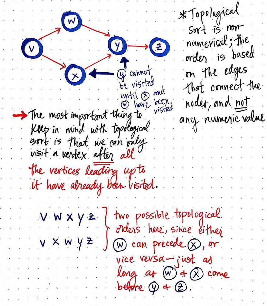 The most important thing to keep in mind when it comes to topological sort is the fact that we can only ever visit a vertex after all the vertices leading up to it have already been visited.