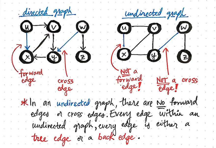An easy way to remember the rules of edge classification is this: an undirected graph can only have tree edges and back edges, but a directed graph could contain all four edge types.